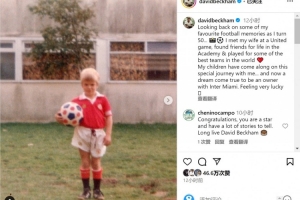 贝克汉姆写道:“50岁之际,回顾一些我最珍贵的足球记忆。我在曼联的一场比赛中遇到了我的妻子,在青训营找到了一生的朋友,并为一些世界上最好的球队效力,”