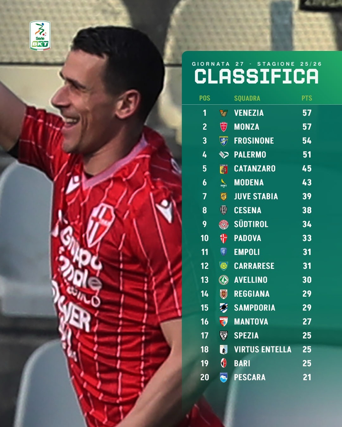 👉 由斯特罗帕🇮🇹教练执教的威尼斯队以17胜6平4负积57分,排名→第1位;